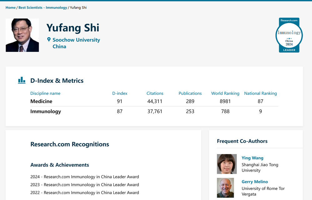 Research.com全球领先的学术研究门户网站之一,提供自2014年以来有关科学贡献的可靠数据,其前身为Guide2Research,自2022年2月起改版为Research.com,每年发布最佳科学家排名。该排名基于D-Index(学科H-Index)指标。在免疫学领域,被纳入评估的D指数阈值是40。