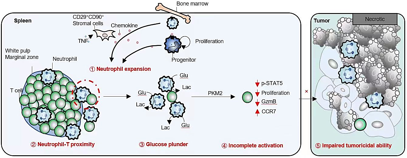 图注:乳腺癌病理进程中,脾脏嗜中性粒细胞的聚集通过剥夺葡萄糖,借以PKM2-STAT5通路削弱T细胞抗肿瘤免疫应答。