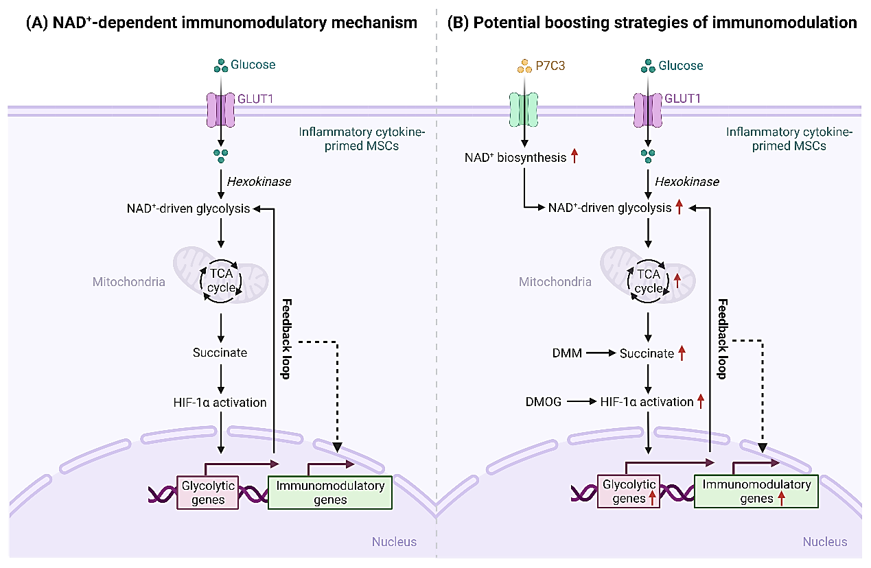图注:NAD+代谢编程间充质干细胞免疫调控功能的作用机制与优化策略示意图