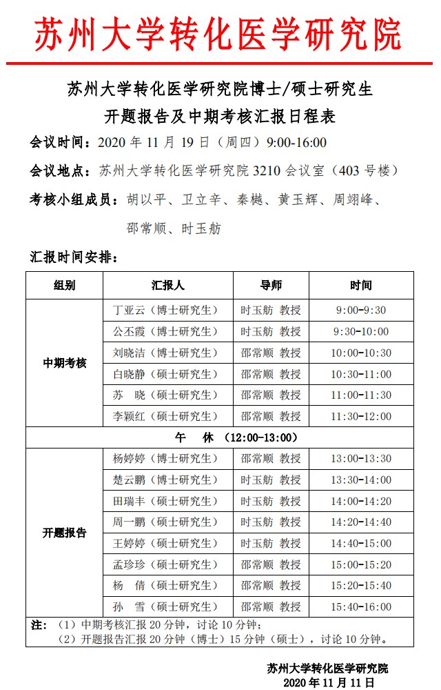 苏州大学转化医学研究院博士/硕士研究生开题报告及中期考核汇报日程表